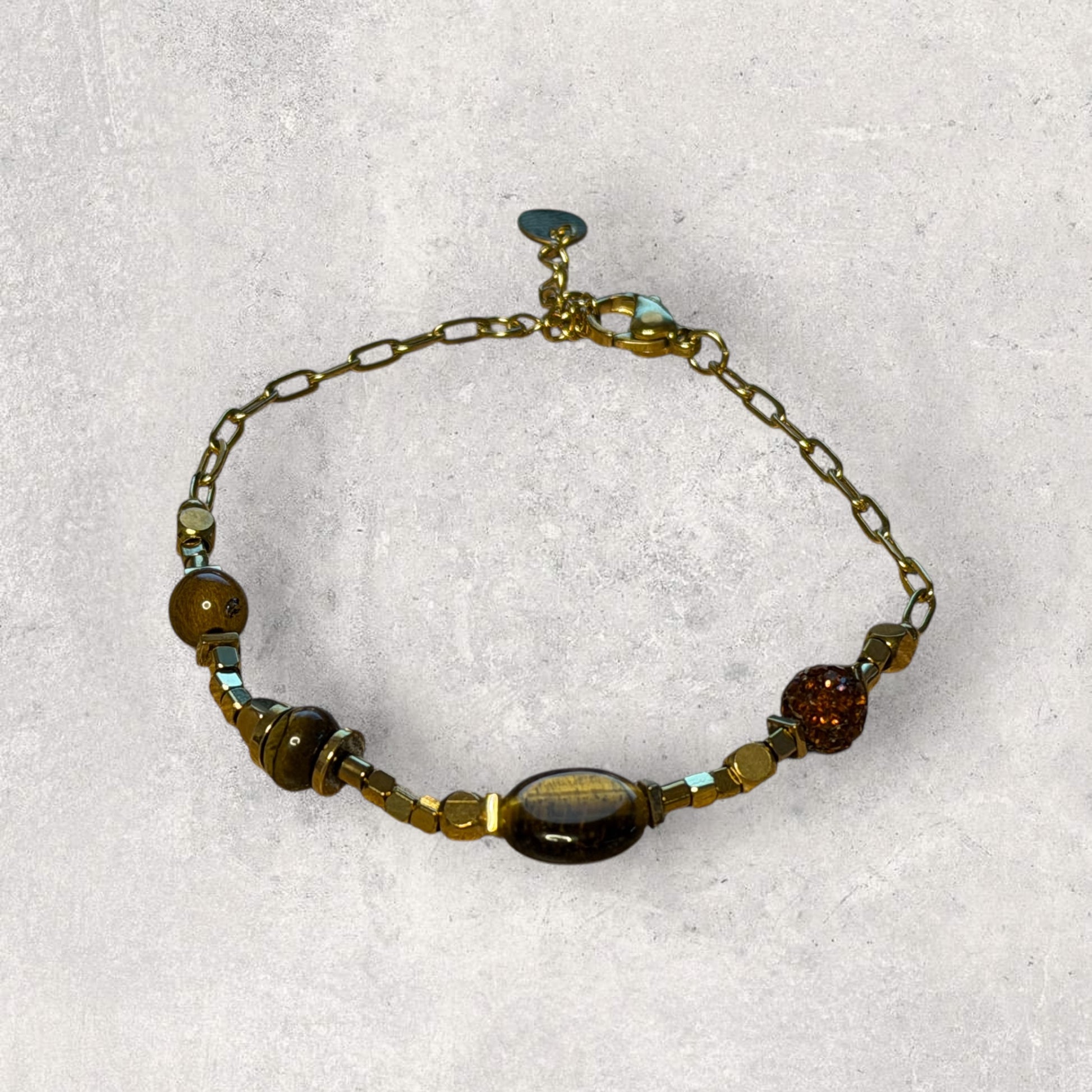 Βραχιόλι με χρυσές χάντρες, πέτρες και textured στοιχεία.